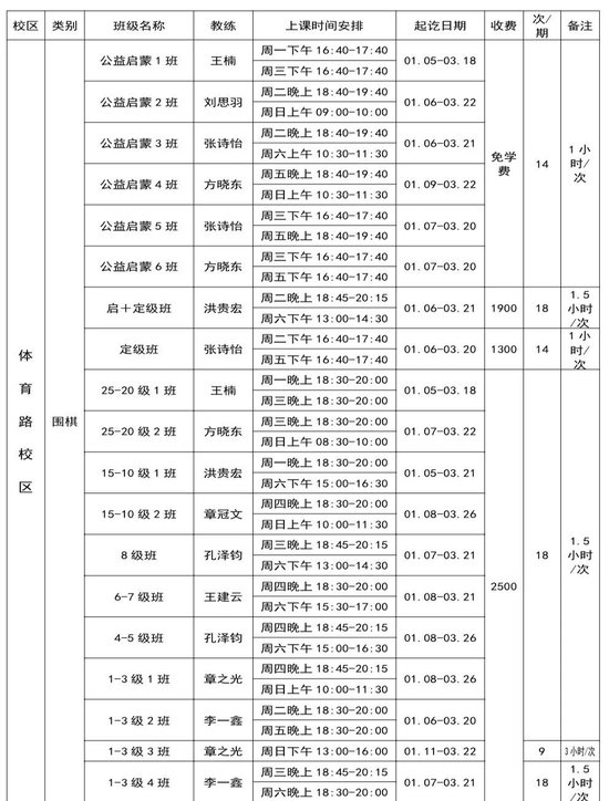 ●体育路校区:82765716、每周2次课的共上课18次,3月25日左右结束。请不要随意改动。其中有2次课为围棋AI训练课(每周1次课的为1次),棋院为其免费开通“弈战学堂(围棋)”教学平台1-3月份的使用权。15058159866(胡老师)、共14次课:围棋8级及以上班级的18次课中(每周1次的为9次课),15867195028(赵老师)